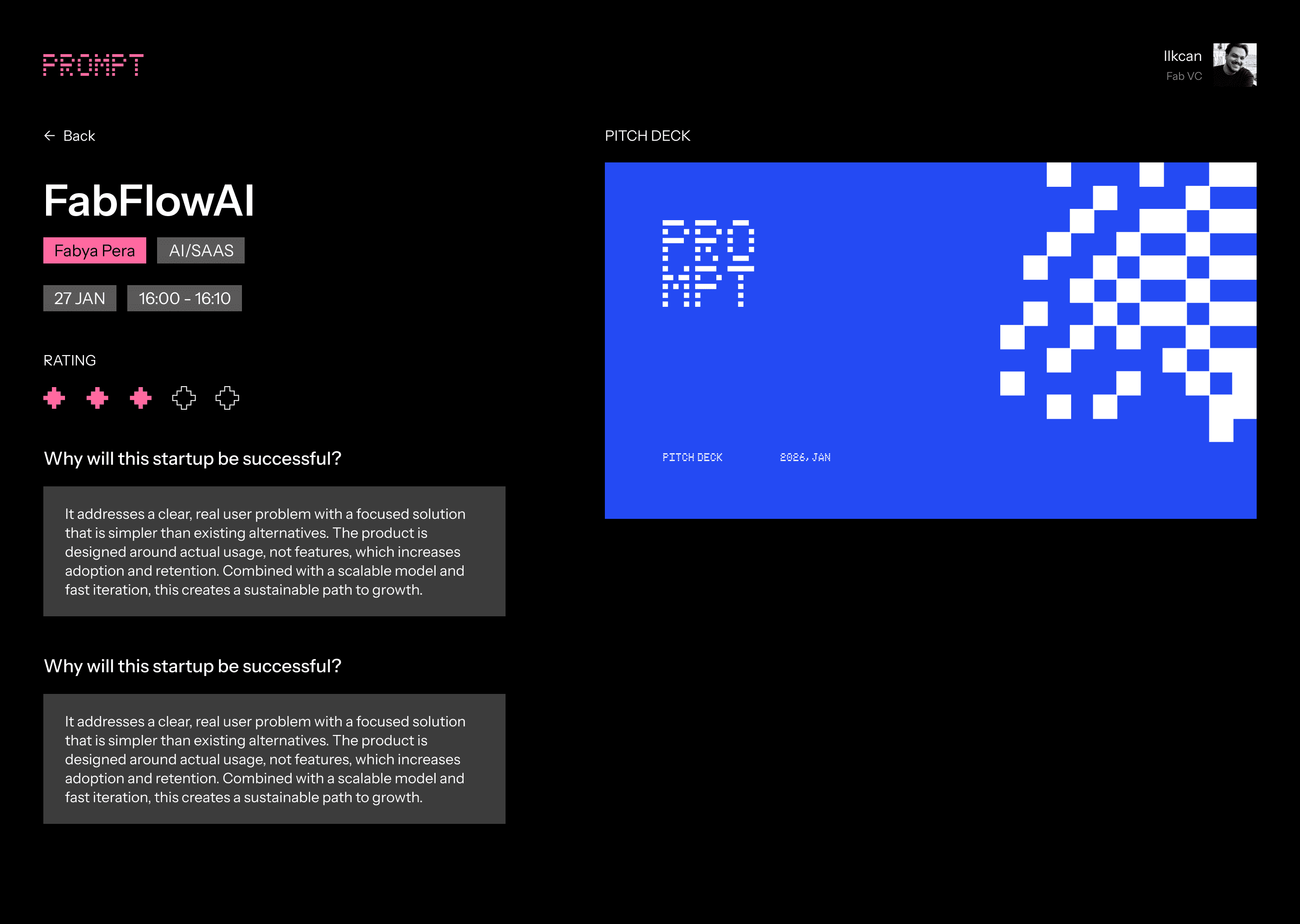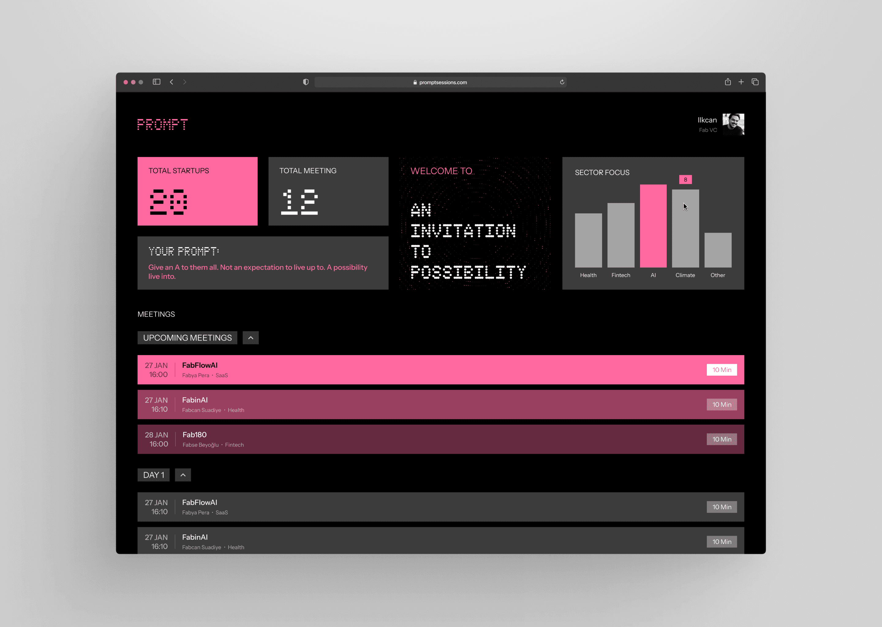 I designed a multi-role dashboard with admin, VC, and startup panels, where VCs and startups are matched, can leave comments and ratings, and track their meetings throughout the Prompt event.